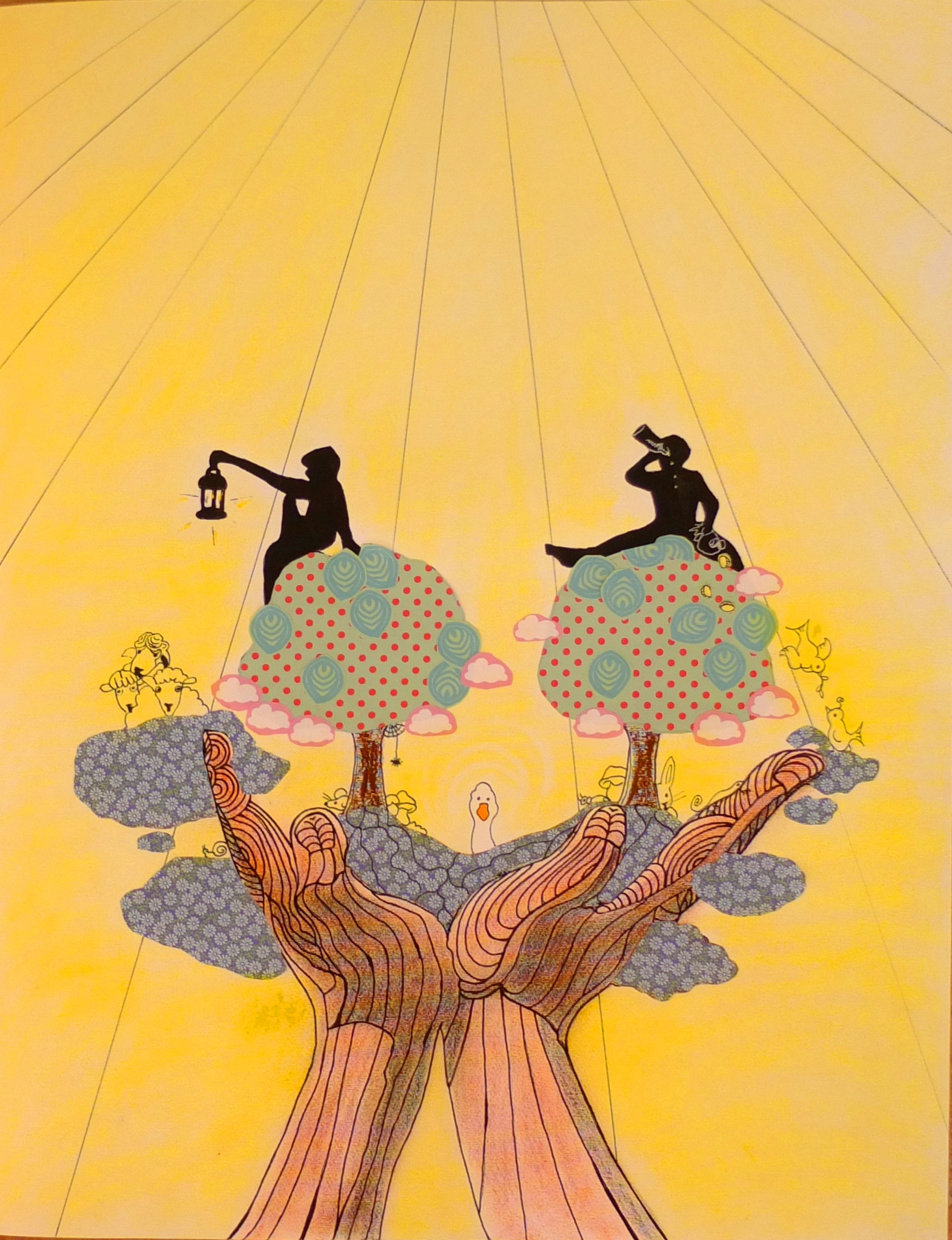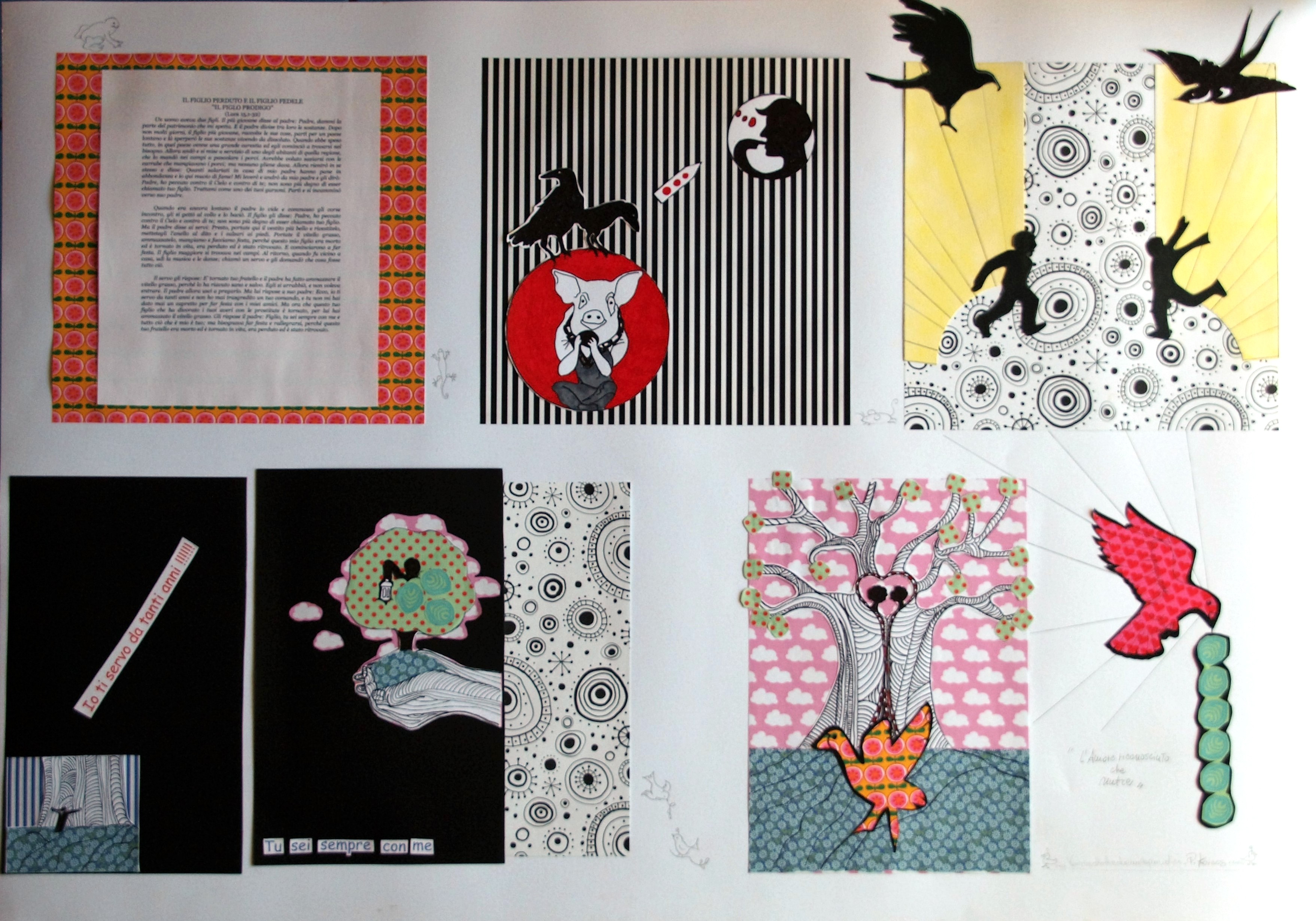 “Ho voglia di illustrare una Parabola, quella parabola! Non so ancora come, comincio così a tracciare dei segni su fogli A4, hm… banali! Devo oziare un pochino e fare finta di non pensarci… gioco con la ” ragione” che non deve sapere che la sto raggirando, la distraggo con un caffè e della musica. Il papà, penso ai papà e mi viene in mente il mio zio Giagante, il mio primo papà che mi ha aiutata a venire al mondo e … ILLUMINAZIONE! Alle sue MANI GIGANTI! Ecco qua l’immagine dell’Albero Padre. Attenta Patrizia! Sorseggia il caffè bollente senza scottarti! ILLUMINAZIONE! Quando senti dolore vedi tutto nero e sei incazzata e hai voglia di urlare e non ti fermeresti neanche davanti ad un Gigante, le parole escono dal Buio, io moscerino incompreso. Il mio ego smisurato vuole la matita! Il mio Ego, i miei pasticci, le mie vergogne, la mia Prigione!!! Ecco le altre tavole; le due facce della stessa medaglia. Però non mi va di disegnare il figlio bello e l’altro brutto; io a volte sono bella e a volte sono brutta… Ecco le figurine nere! A questo punto il caos! L’ALBERO, i figli, alberi con le figurine nere, ALBERI, ALBERI… CAOS, CAOS, CAOS, CAOS=UNIVERSO… Noi. La mano dispettosa infischiandosene bellamente della “ragione” ascolta il cuore, da cosa nasce cosa e il disegno diventa un disegno-collage, c’è caos di matite, pennarelli, forbici, il profumo della colla Cocoina mi fa ritornare bambina, quando avevo voglia di assaggiarla, e meravigliose carte colorate, e anche quando sembra tutto finito la mano dispettosa ci mette un piccolo ragno appeso, forse ancora manca qualcosa…