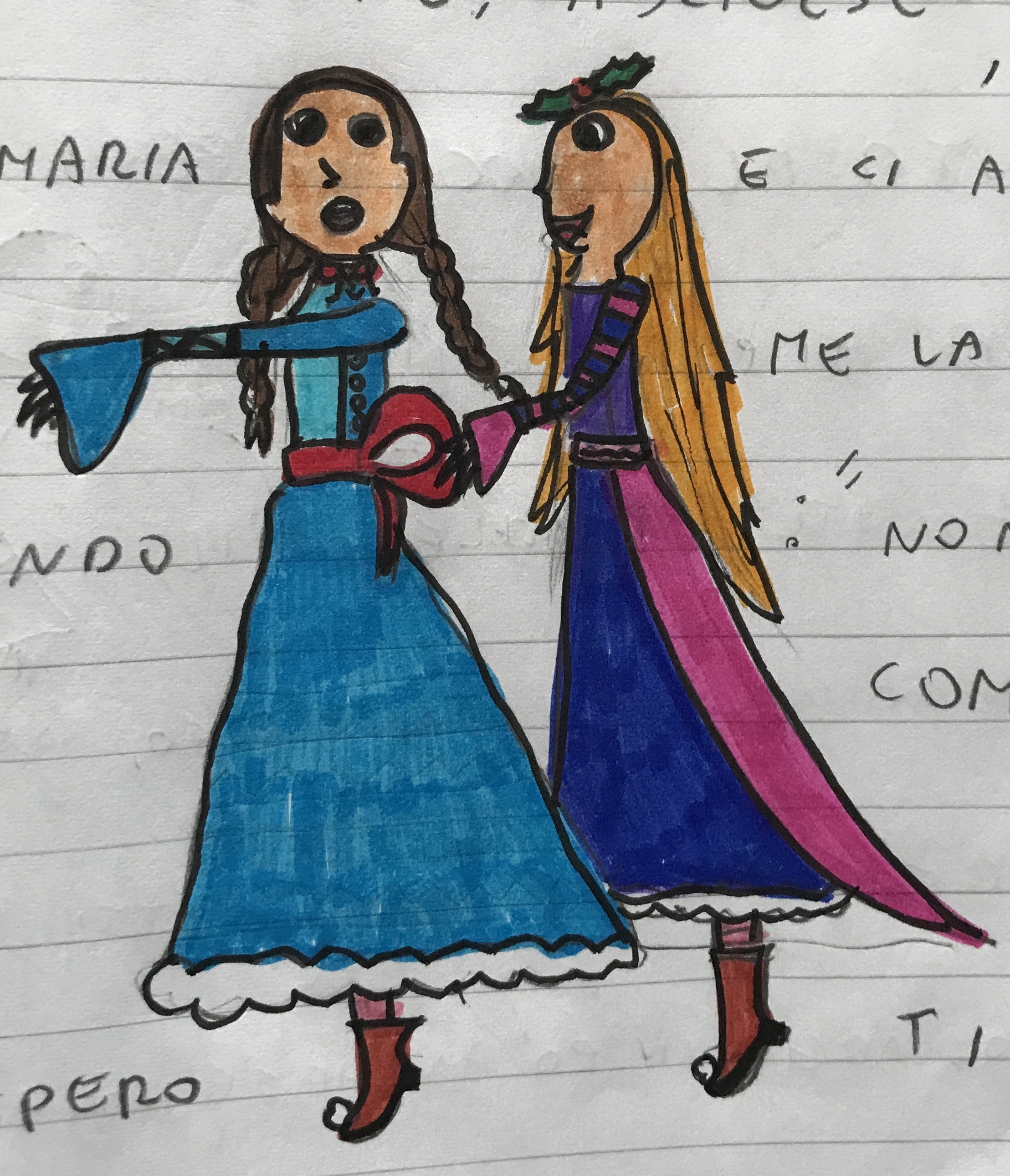 Mi affacciai ad una finestra e vidi che la volta del cielo aveva un buco: da lì intravedevo casa mia! Il segreto sarebbe stato svelato e gli abitanti sarebbero svaniti, dovevo intervenire! Spinsi Brenda e alcuni elfi in una stanza che chiusi a chiave. Continuai così finchè non c’era nessun elfo in giro. Sulla cupola del cielo c’era un deltaplano che gli elfi utilizzavano a Natale per lanciare agrifogli e dolci. Salii le scale, Pallino mi trotterellava dietro con passo veloce.