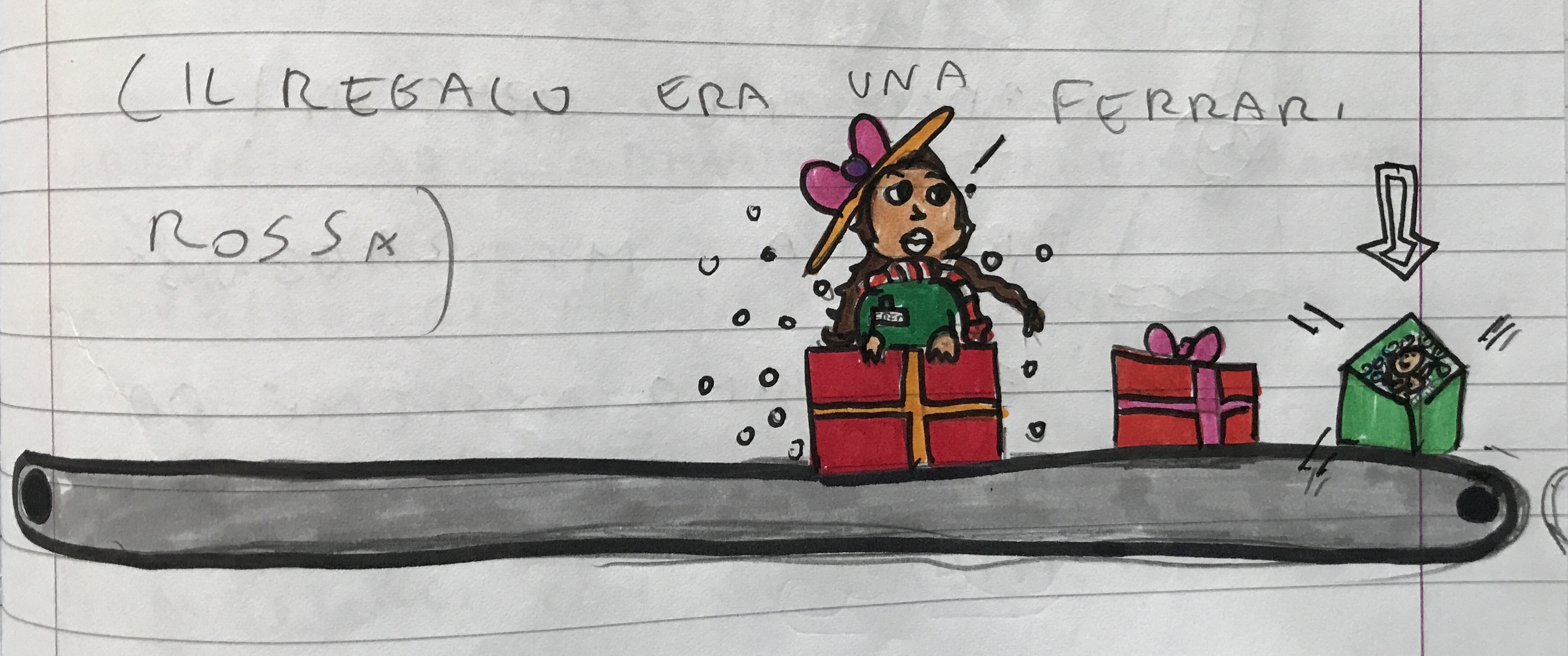 Fummo depositati in un pacco pieno di palline di polistirolo che conteneva una Ferrari rossa giocattolo. Il rullo andava avanti e ci venne spruzzata addosso una raffica di brillantini argentati. Il rullo finì in un’enorme vasca di pacchi che man mano scivolavano in un tubo! Rimasi appesa ad uno spigolo con i pacchi che mi cadevano sulla testa! Afferrai quello non incartato e mi lasciai cadere nella vasca.