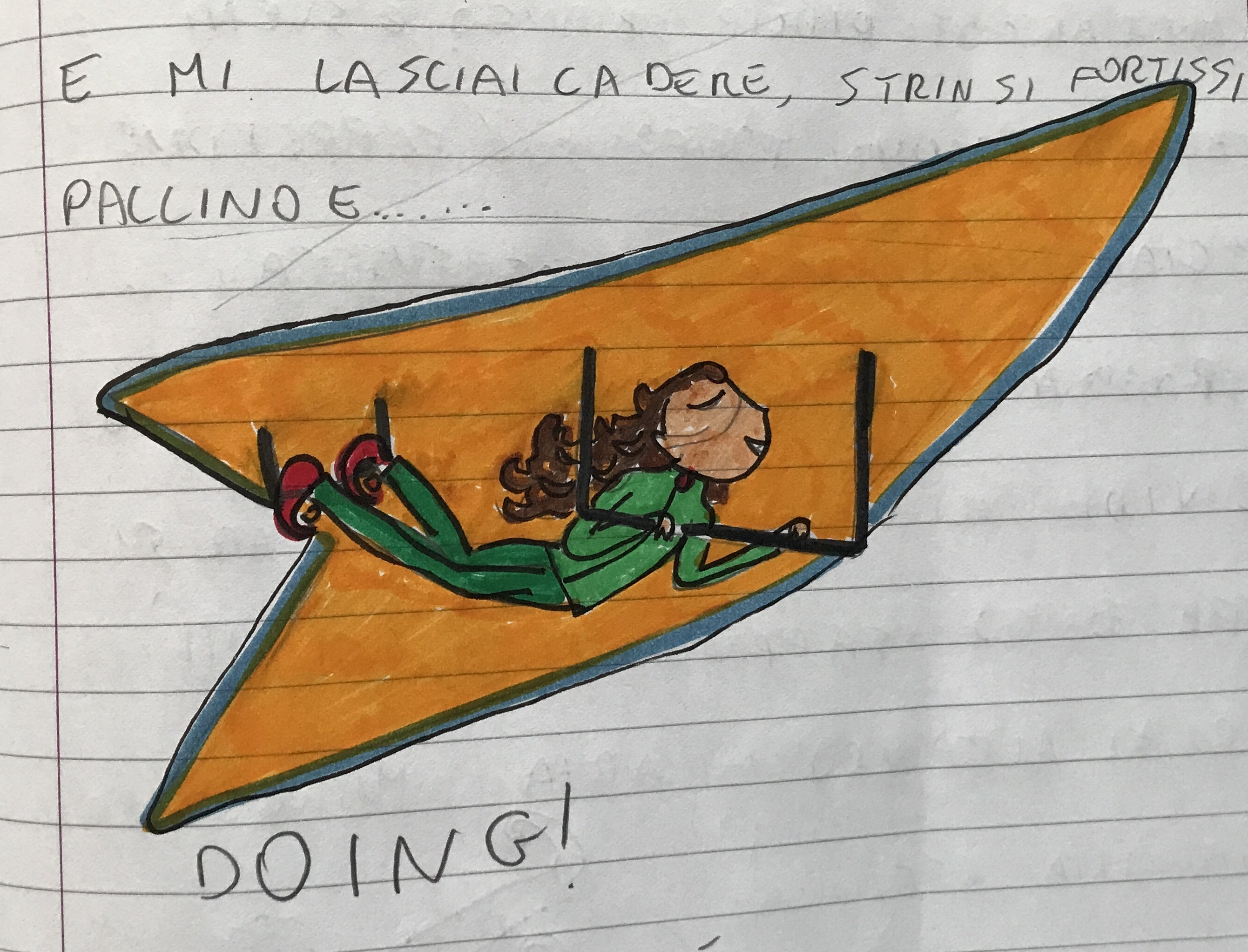 “Ok Pallino, ora salta nella tasca e copriti bene” dissi mentre afferravo il deltaplano. Ero sul terrazzone, non ero vestita adeguatamente e congelavo, non ero sicura di quello che stavo facendo, avrei potuto morire. Ormai la mia identità era stata svelata perché i capelli svolazzavano al vento. Ero sul ciglio, presi la rincorsa e mi lanciai. Il capello da elfo volò via, mi direzionai verso il buco. Mi stavo avvicinando sempre di più, intanto contemplavo il paesaggio dall’alto. Era ancora più magico! Ero vicina al buco, chiusi gli occhi e mi lasciai cadere, strinsi fortissimo Pallino e….Doing! fece proprio così: Doing!